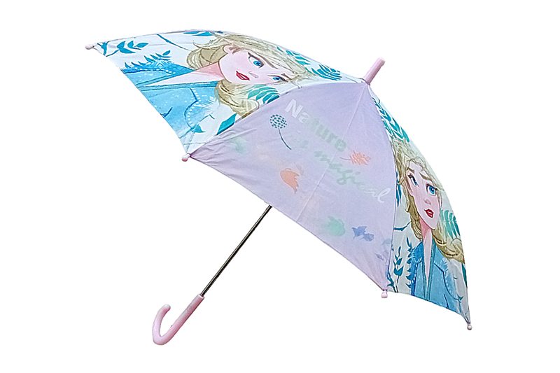 Az esernyő fő színei a halvány lila és rózsaszín, melyekkel garantáltan kitűnik a tömegből. A manuálisan nyitható esernyő könnyedén kezelhető, így még a kicsik is könnyen boldogulnak vele. A markolat rózsaszín, szürkével ellátott Elsa felirattal, ami még egyedibbé teszi az esernyőt.