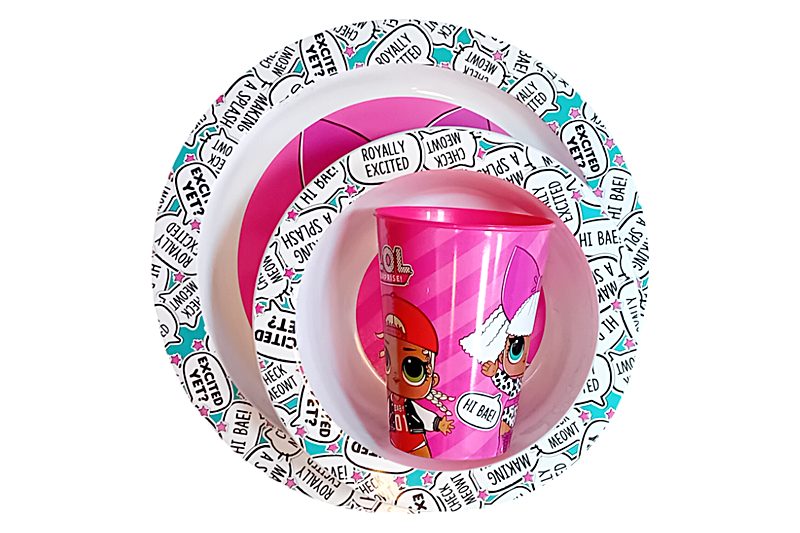 LOL baba étkészlet – 3 részes (lapos, mélytányér, pohár). LOL Surprise készlet kislányok számára.