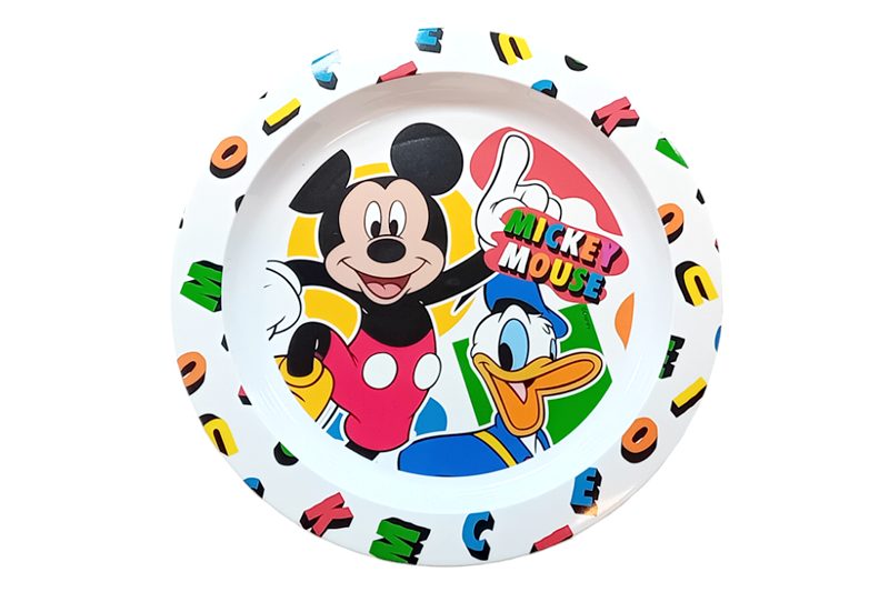 Ez a vidám Mickey egeres lapos tányér tökéletes választás a kisgyermekek számára. Az anyaga BPA-mentes műanyag, ami biztonságos és tartós használatot biztosít. A tányér alapszíne fehér, amit színes betűkkel körbefutó “Mickey” felirat díszít a peremén. A belső részen Mickey egér kedves, huncut mosolya köszön vissza Donald kacsával együtt, ami garantáltan jókedvre deríti a kicsiket.