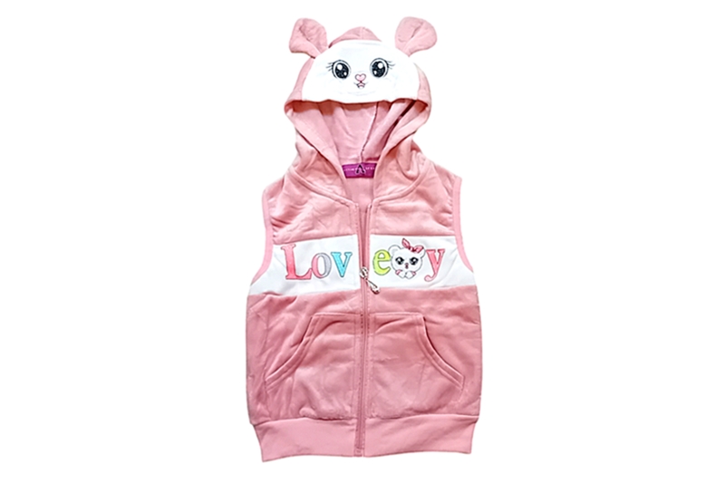 Kislány mellény, plüss, kapucnis, cipzáras – lazac rózsaszín. Kapucniján maci minta, maci fülek.
