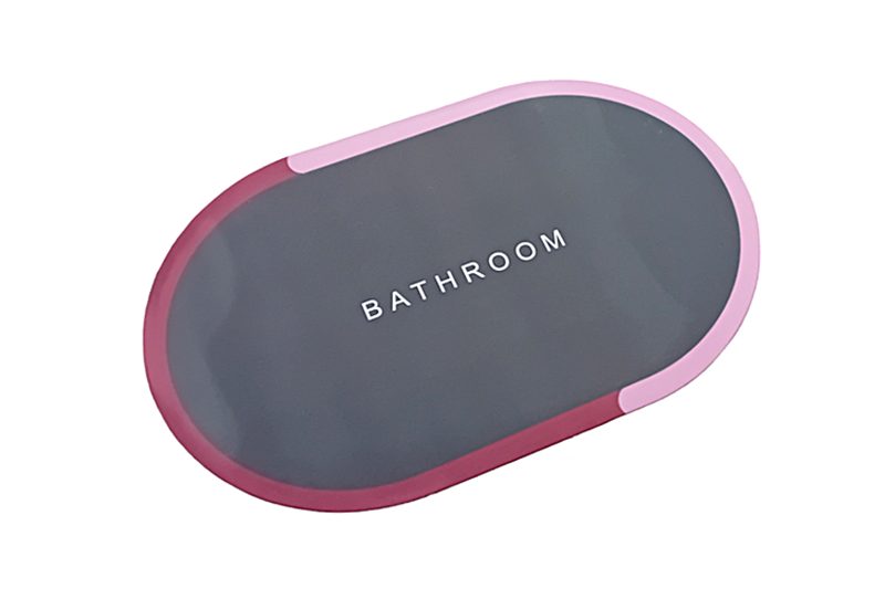 A sötétszürke alapon körben rózsaszín és bordó csíkkal díszített széle modern, fiatalos megjelenést kölcsönöznek a fürdőszobának. A szőnyeg közepén lévő fehér „Bathroom” felirat még inkább feldobja a helyiséget.
