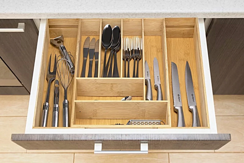 Az evőeszközöket és egyéb konyhai kiegészítőket kényelmesen tárolhatja a bambusz rendszerezőben. Lehetővé teszi a villák, kanalak, kések és egyéb konyhai felszerelések elkülönítését. Ha az evőeszközöket a rendszerezőben tárolja, megakadályozza a fiók sérülését. Az evőeszközök élettartamát is meghosszabbíthatja, ha megvédi őket a karcolásoktól. A bambusz tálca tartós és nedvességálló. Praktikus kiegészítője lesz az étkező és a konyha dekorációjának.
