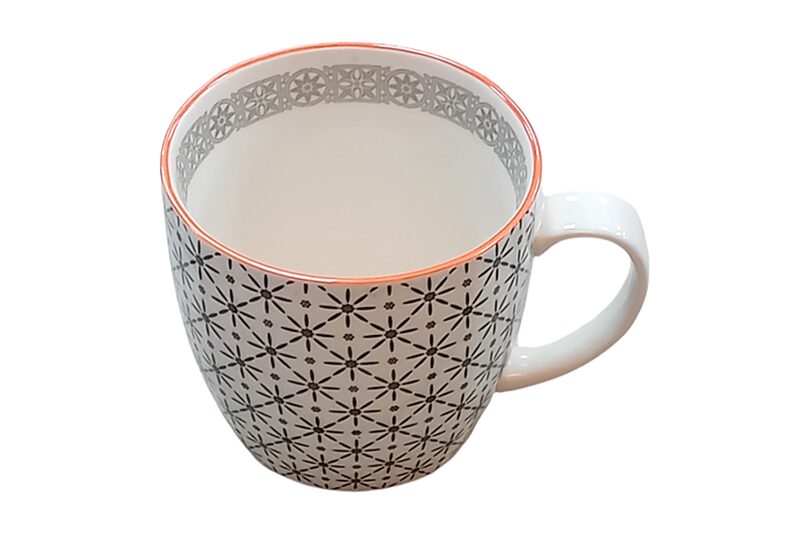 Porcelán bögre (nagy) L (Nora’s Design) – 500 ml (fehér-fekete-szürke, narancssárga szegéllyel).