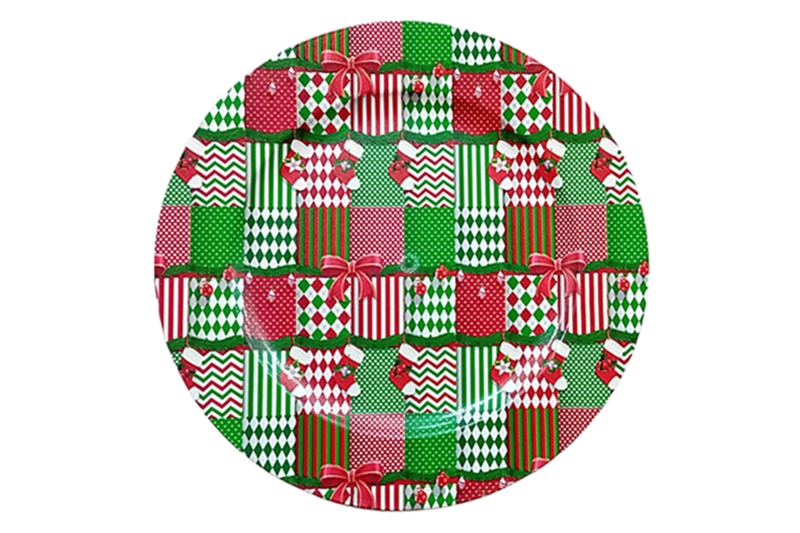 Műanyag lapos tálca karácsonyi mintával – 35 cm (zöld-piros-fehér).