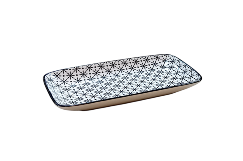 Porcelán négyszögletes hosszúkás tál (Nora’s Design) – 12×22 cm, fekete (geometrikus, virág).