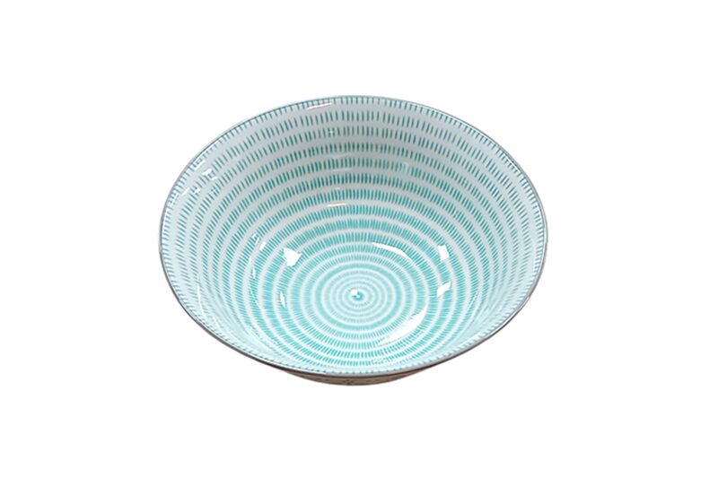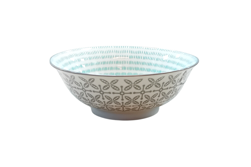 Porcelán nagy tál, Ø 23,5 cm – belül zöld örvény, kívül szürke geometrikus stilizált virágmotívumos.