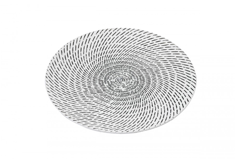 Porcelán lapos kis tányér – Nora’s Design – 26,5 cm, örvény mintás, fehér-fekete.
