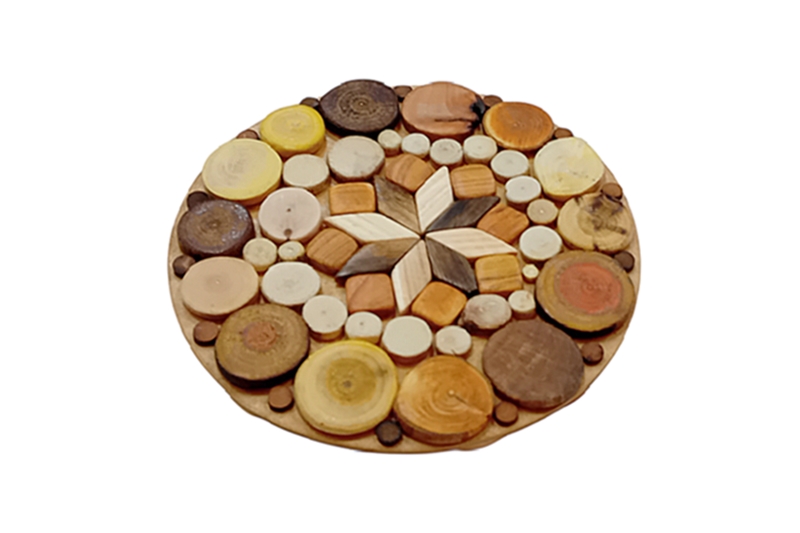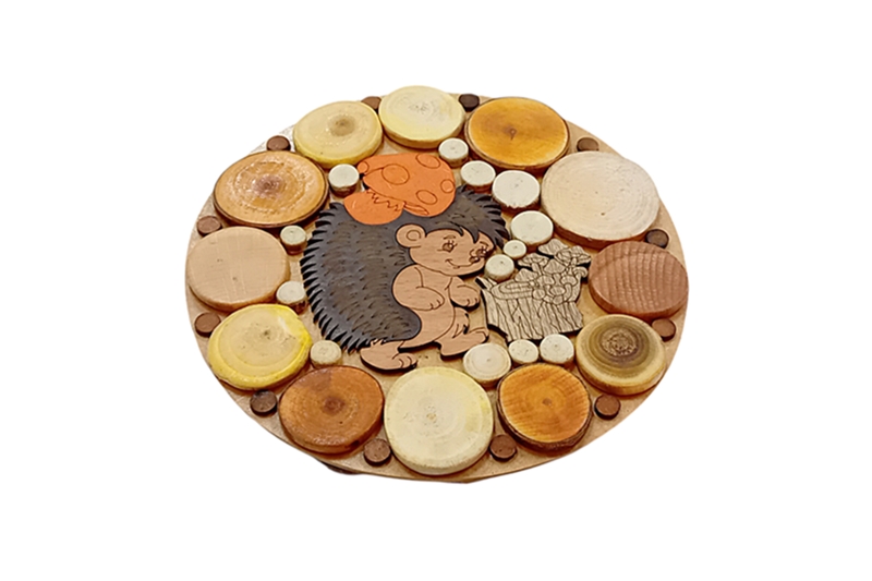 Kerek, fa edényalátét – Ø 18,5 cm, sünivel, fa szeletekkel (mindkét oldalán).