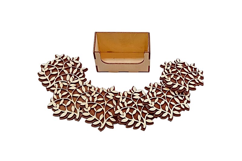 6 db poháralátét tartóban, rétegelt fa lemezből. Két rétegű, lézeres technikával készített, fa formájú. Dekorációs célból, de az asztal és a terítő védelméül is szolgál – folyadékkiömlés ellen.