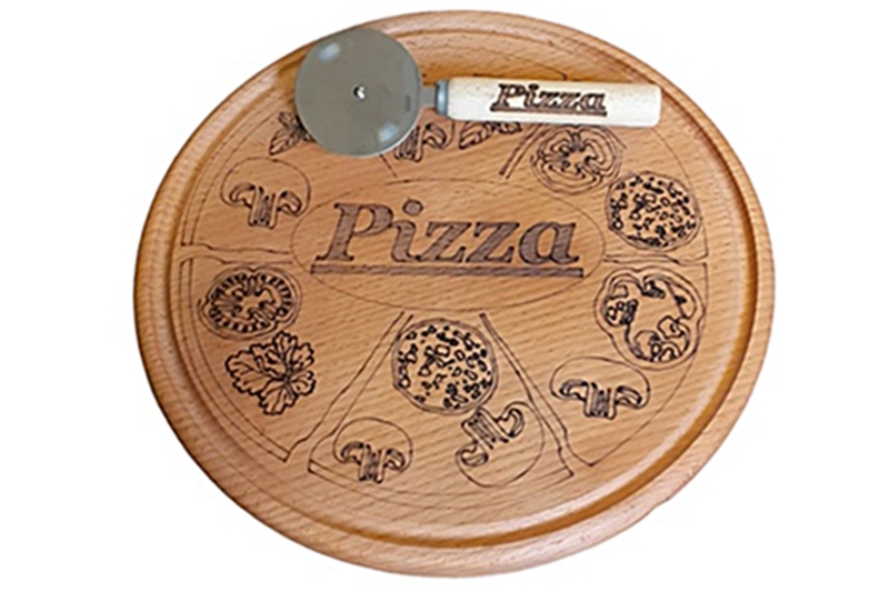 Pizzatálaló, szervírozó szett – 35 cm átmérőjű. Pizzavágó mérete: 18 cm, kése rozsdamentes, átmérője 7 cm. A tálalón és a pizzavágón is pizza felirat található. Pizzaszeletek, rajzolatával rendelkezik, melyek megkönnyítik a pizza egyenletes szeletelését.