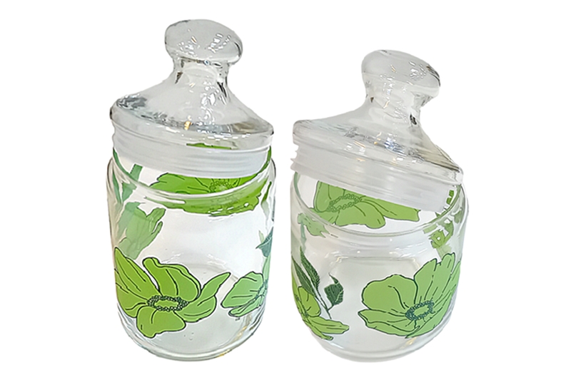 Virágmintás üveg tároló készlet. Légmentesen záródó tetővel felszerelt tárolók. A 1 különböző méret kiválóan alkalmas akár száraz ételek, úgy mint tészták, sütemények, de szemes, darát kávé tárolására is kiválóan alkalmas.