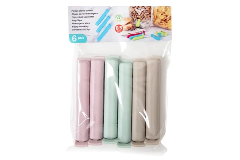 Zacskózáró csipesz – 6 db, 8,5 cm (rózsaszín-menta-bézs). Színenként 2 db.