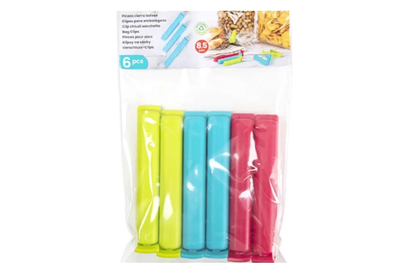 Zacskózáró csipesz – 6 db, 8,5 cm (zöld-kék-pink). Színenként 2 db.