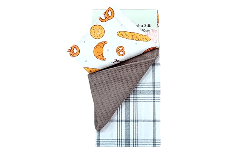 Konyharuha, 3 db (barna, szürke, fehér-péksütis), 45×70 cm méretben.