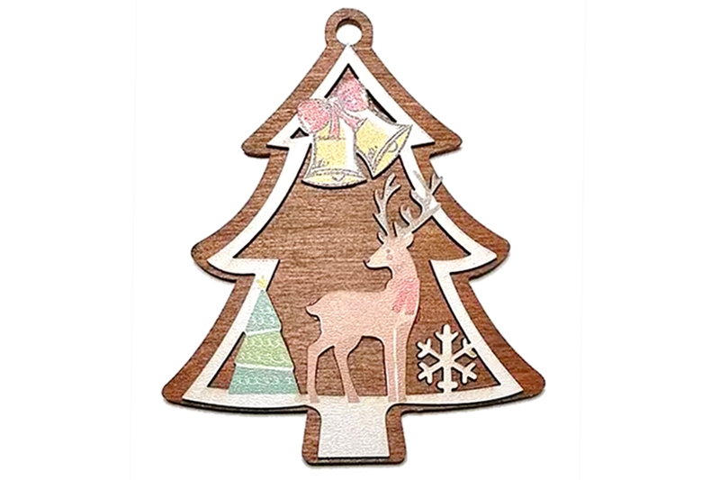 Többrétegű karácsonyfadísz, melynek mindkét oldala azonos mintájú és színű. Magassága 9 cm. A fadísz tetején karika található, melynek segítségével felfüggeszthető.