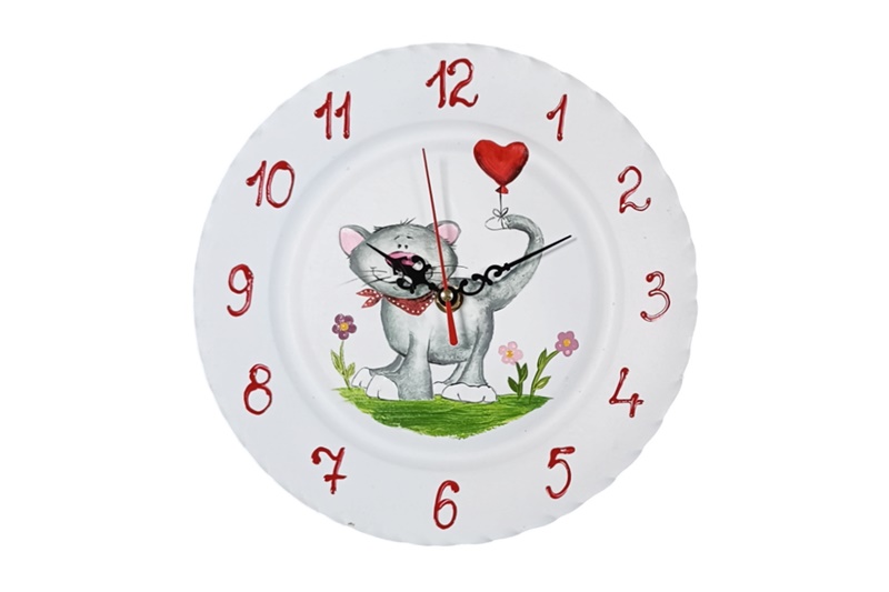 Kézműves színes kerámia falióra, cica mintával 25 cm. Ø