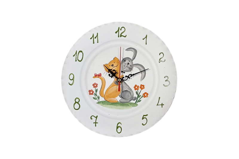 Kézműves színes kerámia falióra, nyuszi-cica mintával 25 cm. Ø
