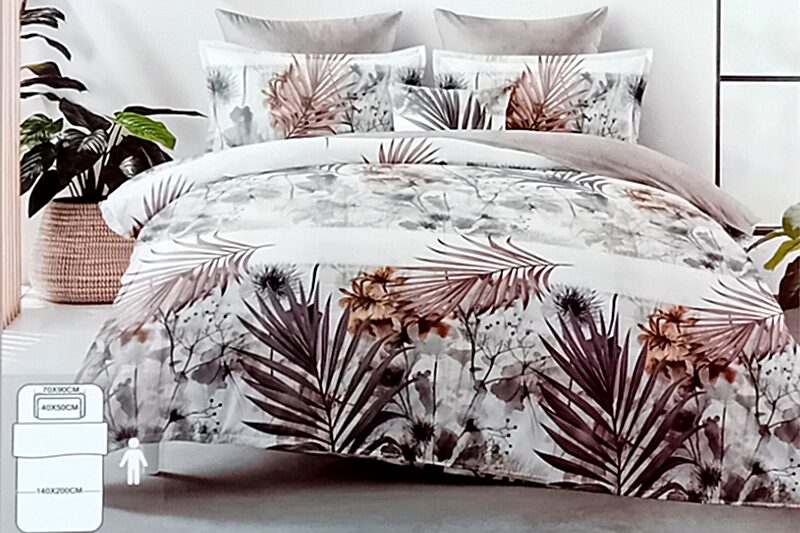 Flanel jellegű ágyneműhuzat garnitúra – 3 részes (pálmaleveles, fehér alapon barna és szürke színű).