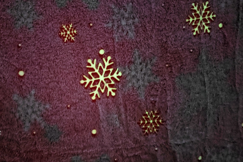 Különleges, sötétben világító, azaz foszforeszkáló karácsonyi ágytakaró. A manók, fenyők és hópelyhek motívumai vidám színekkel – piros, kék és fehér – elevenednek meg, míg a hópelyhek különleges foszforeszkáló anyaguknak köszönhetően zölden világítanak a sötétben, miután fény hatására feltöltődnek. A takaró puha és nagyon kellemes tapintású. Finom textúrája, puha kézérzete miatt funkcióját rendkívül jól tölti be.