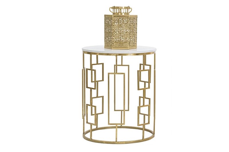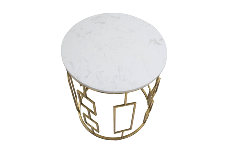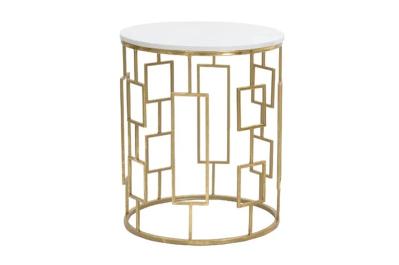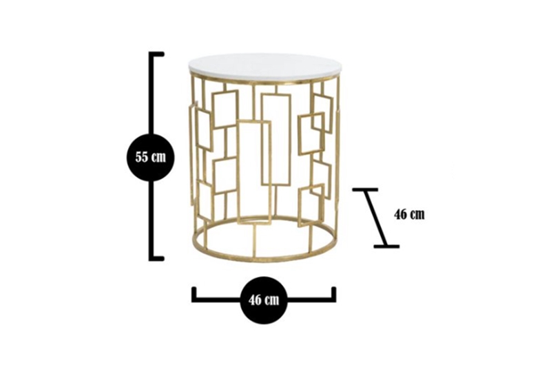 A fém geometrikus mintázatú lábazat és a henger formájú kialakítás egyedülálló karaktert kölcsönöznek az asztalnak. A fehér asztallap kontrasztot teremt az arany lábazattal, ami luxus és elegancia érzetét kelti. A színkombinációk tökéletes harmóniát teremtenek, és a bútor bármilyen stílusú enteriőrrel remekül harmonizál.