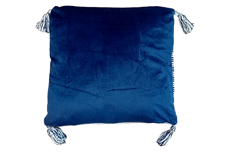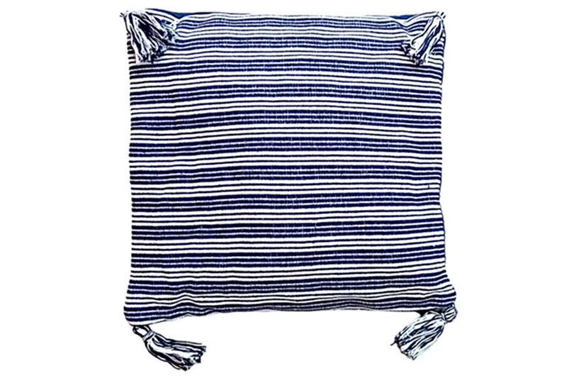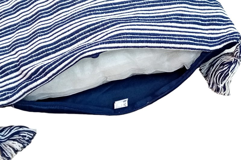 Díszpárna – 45×45 cm – kék-fehér bojtos (keresztben csíkozott).