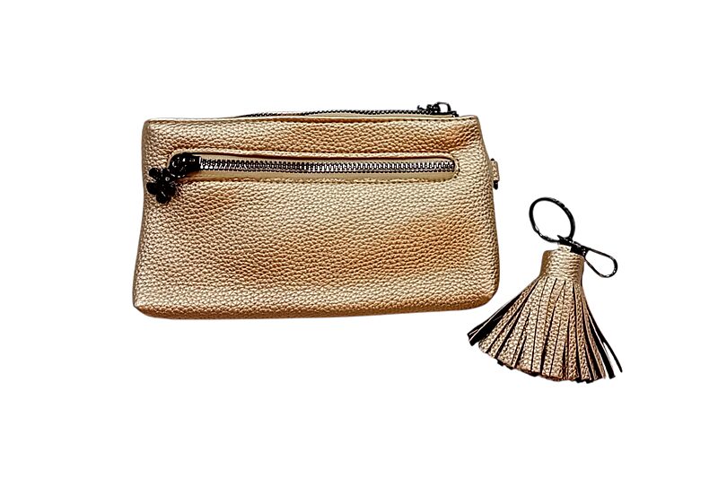 Női pénztárca bojttal – arany, 19x3x10 cm (műbőr).