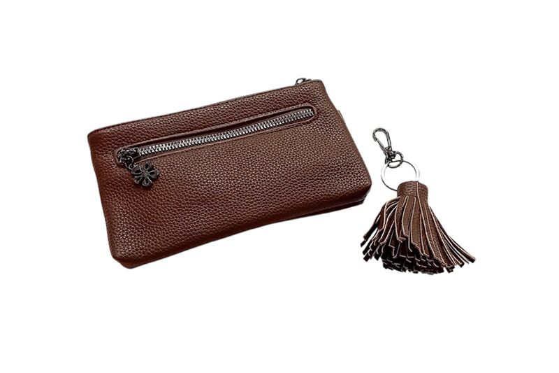 Női pénztárca bojttal – kávébarna, 19x3x10 cm (műbőr).