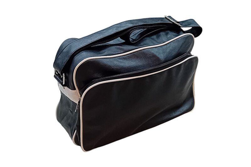 Fehér díszítéssel és szegéllyel, cipzározható elülső és hátsó (kis) zsebbel. Állítható vállpánttal.