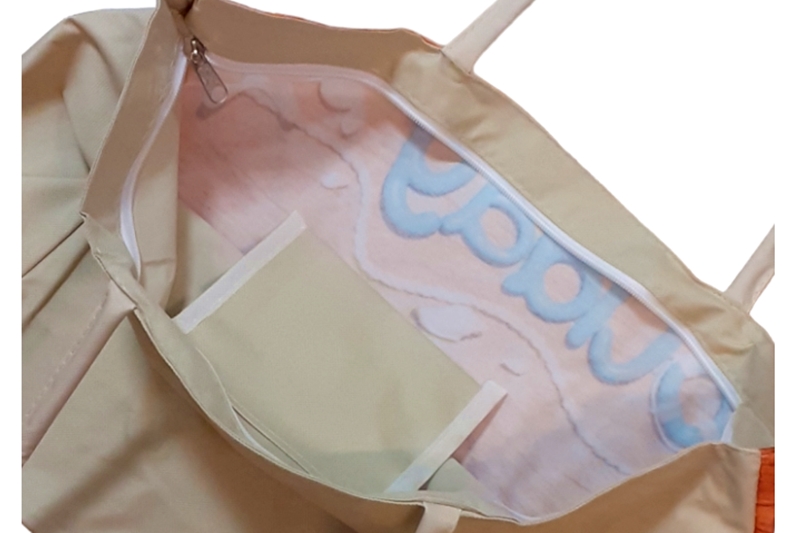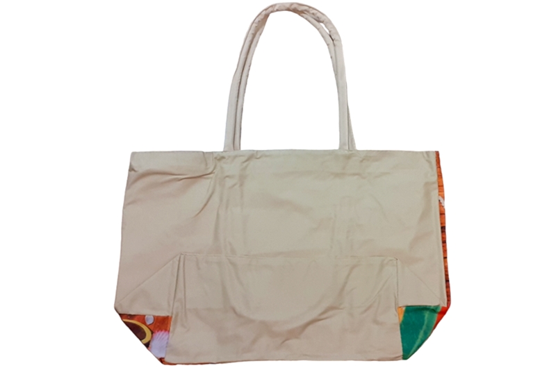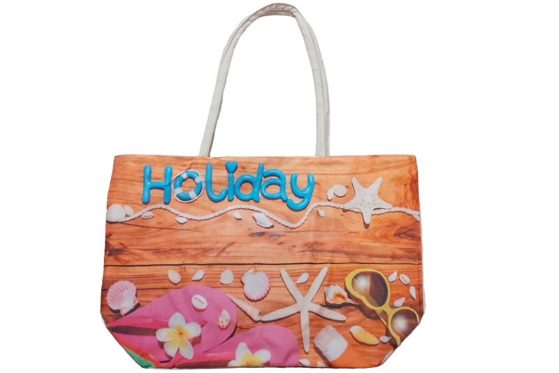 Strandtáska – nagy méretű, Holiday, nyári mintával. Bélés nélküli, egy légterű, kisebb zsebbel.