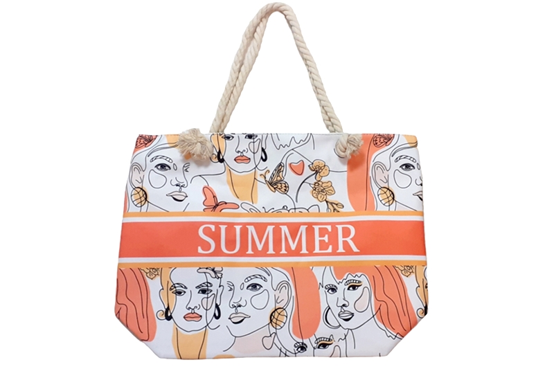 Strandtáska – fehér/narancssárga summer felirattal. Hátulja egyszínű, bézs.