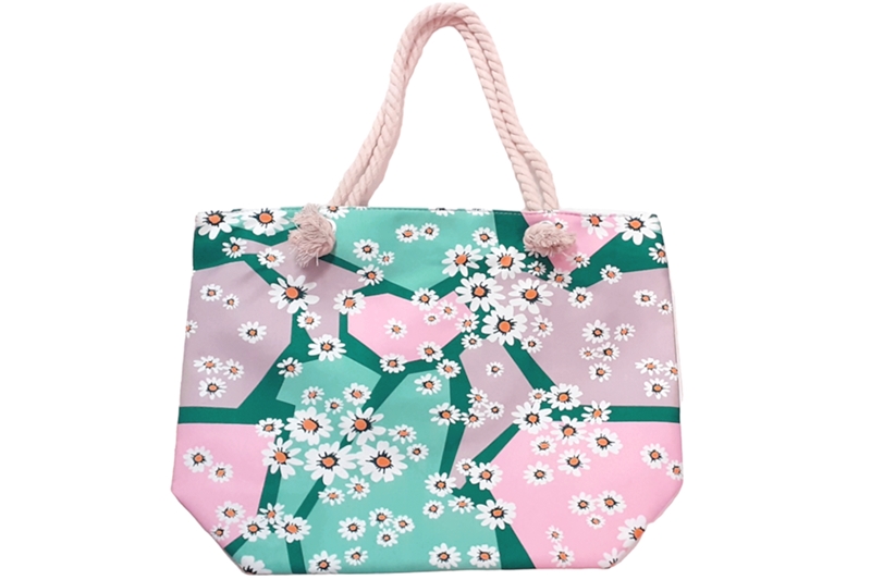 Strandtáska – vidám, színes alapon fehér margarétákkal. Hátulja egyszínű, bézs.